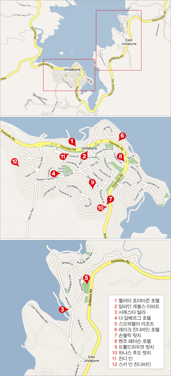 Áø´Ù¹ÙÀÎ(Jindabyne) ¸¶À»¿¡ À§Ä¡ÇÑ È£ÅÚ À§Ä¡ ÁöµµÀÔ´Ï´Ù. À̰÷¿¡ ³ª¿ÍÀÖ´Â °¢ È£ÅÚÀº ½ºÅ°½ºÅ° ´å ÄÄ¿¡¼ ¼±Á¤ÇÏ¿© »ç¿ëÇÏ´Â ÃÖ°íÀÇ ½Ã¼³°ú °¡Àå ÁÁÀº °÷¿¡ À§Ä¡Çϰí ÀÖ½À´Ï´Ù.